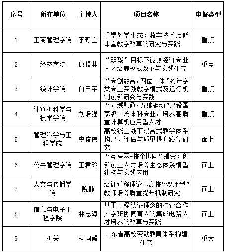 根据山东省教育厅《关于做好2022年本科教学改革研究项目立项申报和管理工作的通知》(鲁教高函〔2022〕27号)文件精神,经各二级学院组织项目申报,专家匿名评审,拟推荐以下项目申报2022年山东省教学改革研究项目,现将名单公示如下: