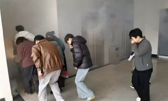 为使培训成果落地生根,理论培训结束后,全体参训师生移步至演练场地,开展了模拟烟雾环境下的逃生演练。在浓烟弥漫的模拟场景中,师生们严格按照培训要领,捂住口鼻,低姿弯腰,沿墙壁和疏散指示标志有序撤离,亲身体验了火场的紧张氛围并掌握了正确的逃生自救技能。整个演练过程组织严密、行动迅速,达到了预期效果。